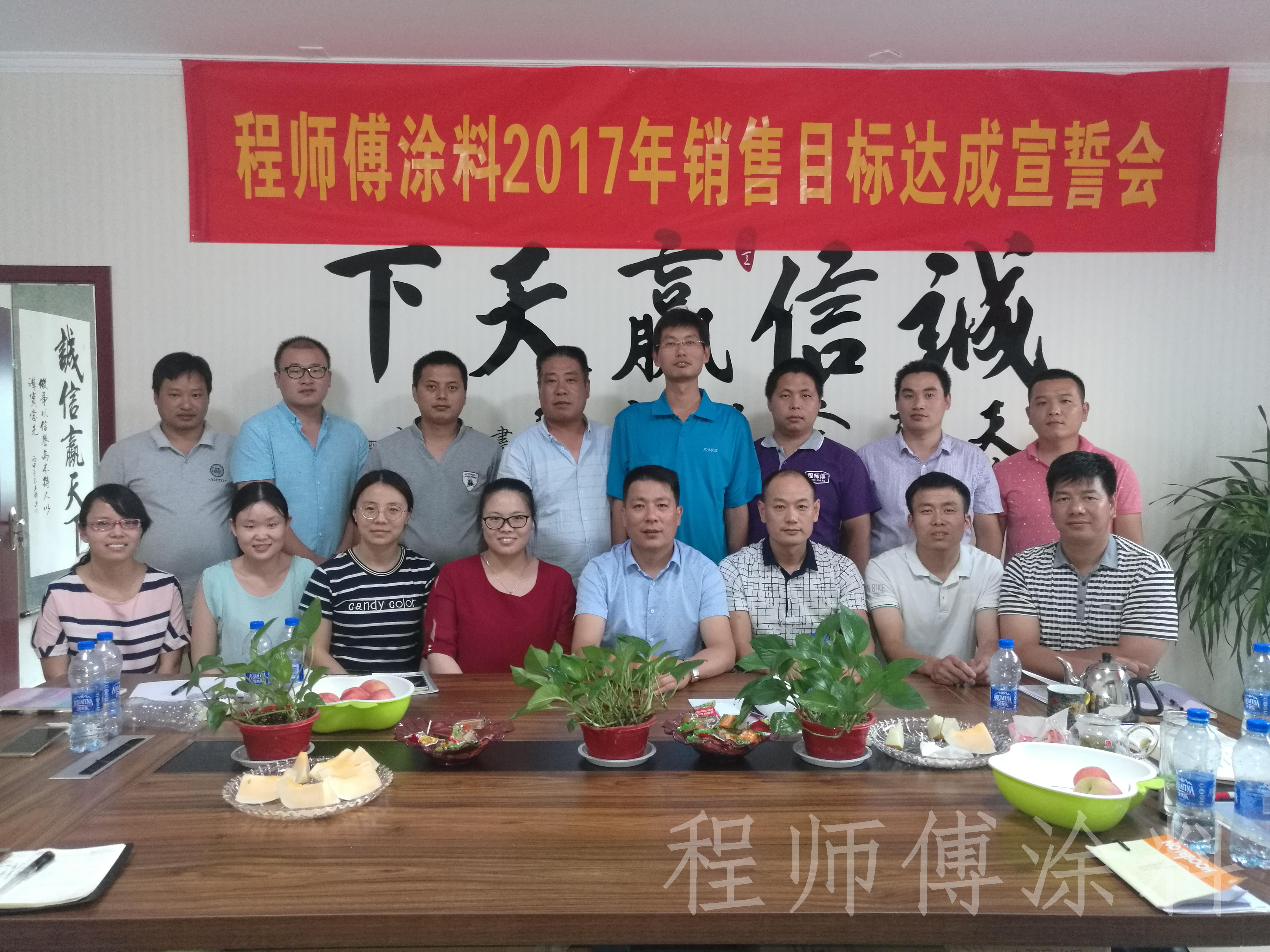 2017年6月25日,雖然是周末,但對(duì)于程師傅大家庭的成員來(lái)說,這一天是不平凡的一天,是充實(shí)而又奮進(jìn)的一天,程師傅2017年銷售目標(biāo)宣誓大會(huì)于這一天隆重召開,會(huì)議由程師傅總經(jīng)理程總主持召開,參與此次盛會(huì)還有程師傅涂料的16員大將。